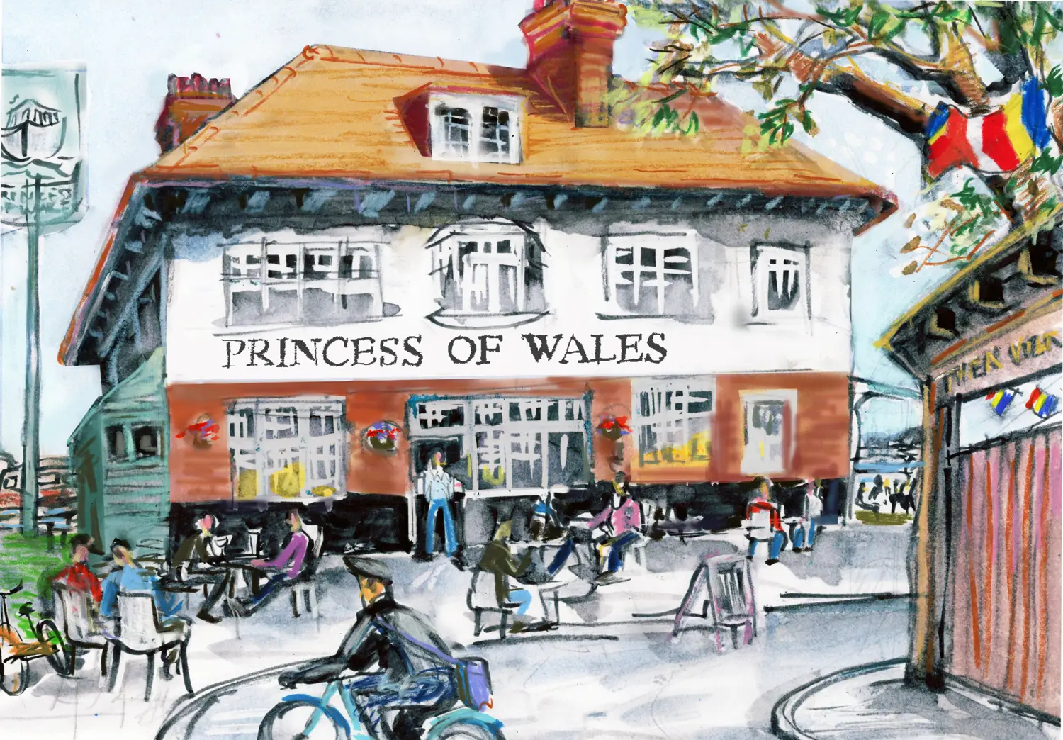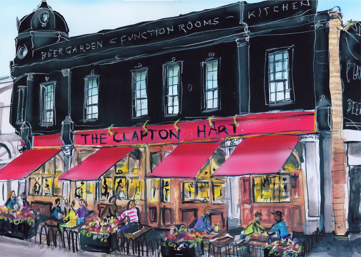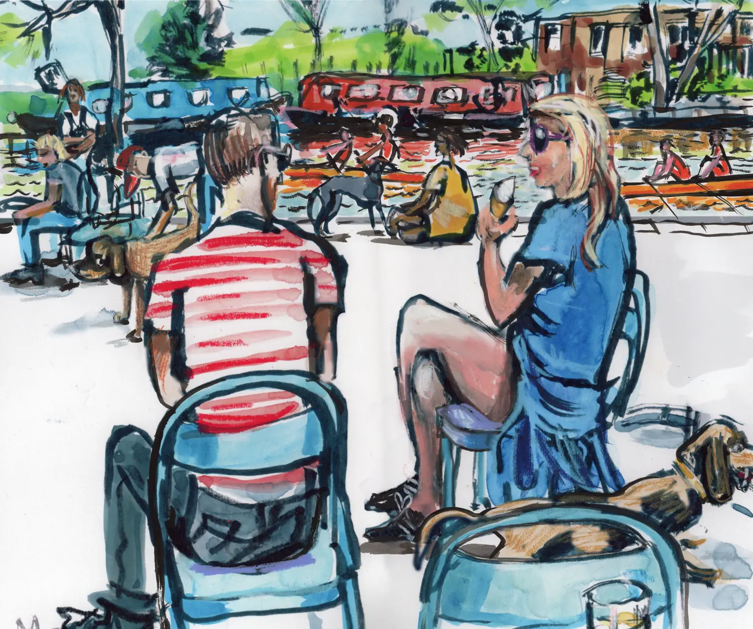 I populated the original ink drawing with people as it felt a bit sad and lonely with no one there. The dog is becoming a bit of a theme.