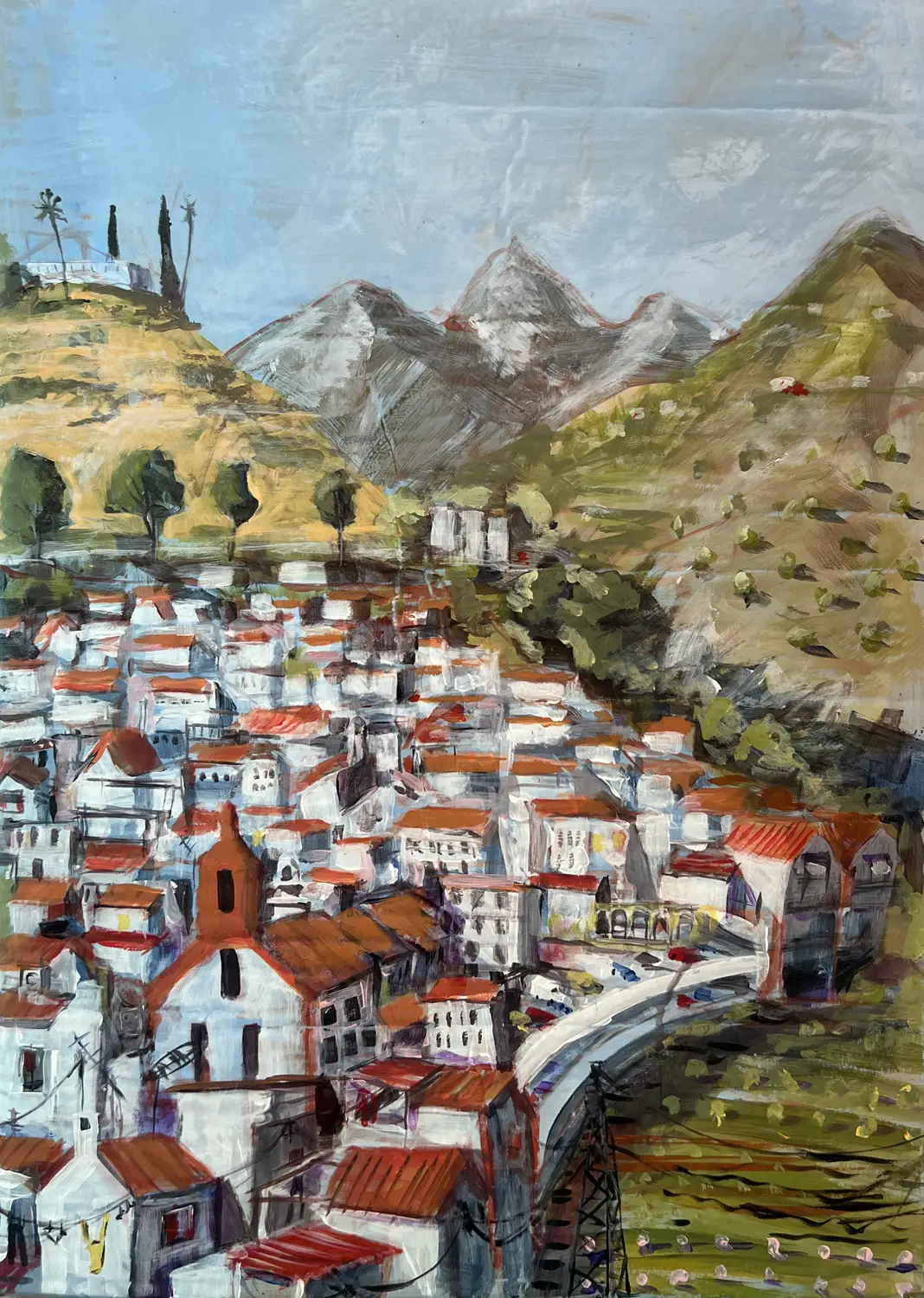 Stinking hot day, a beautiful turquoise sea and golden sand. made for a delicious colour palette. Acrylic on canvas panel 40 x 30 cm