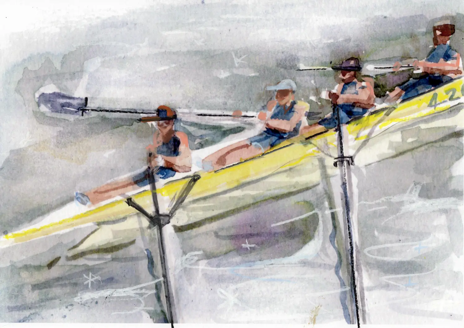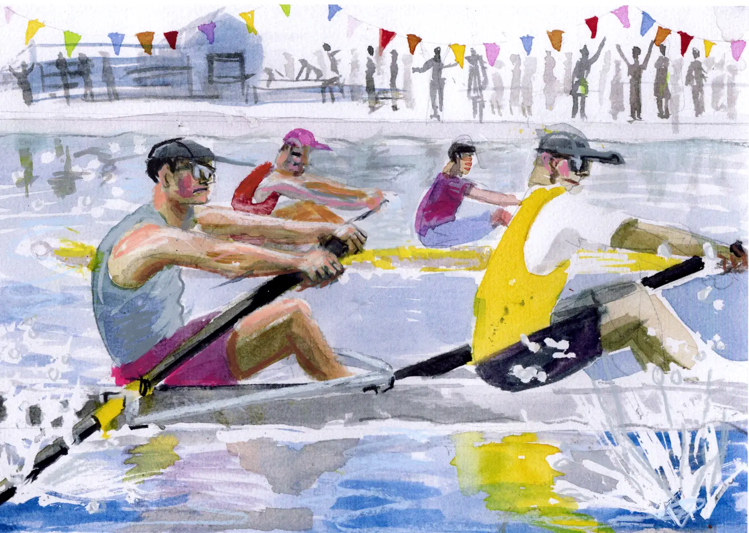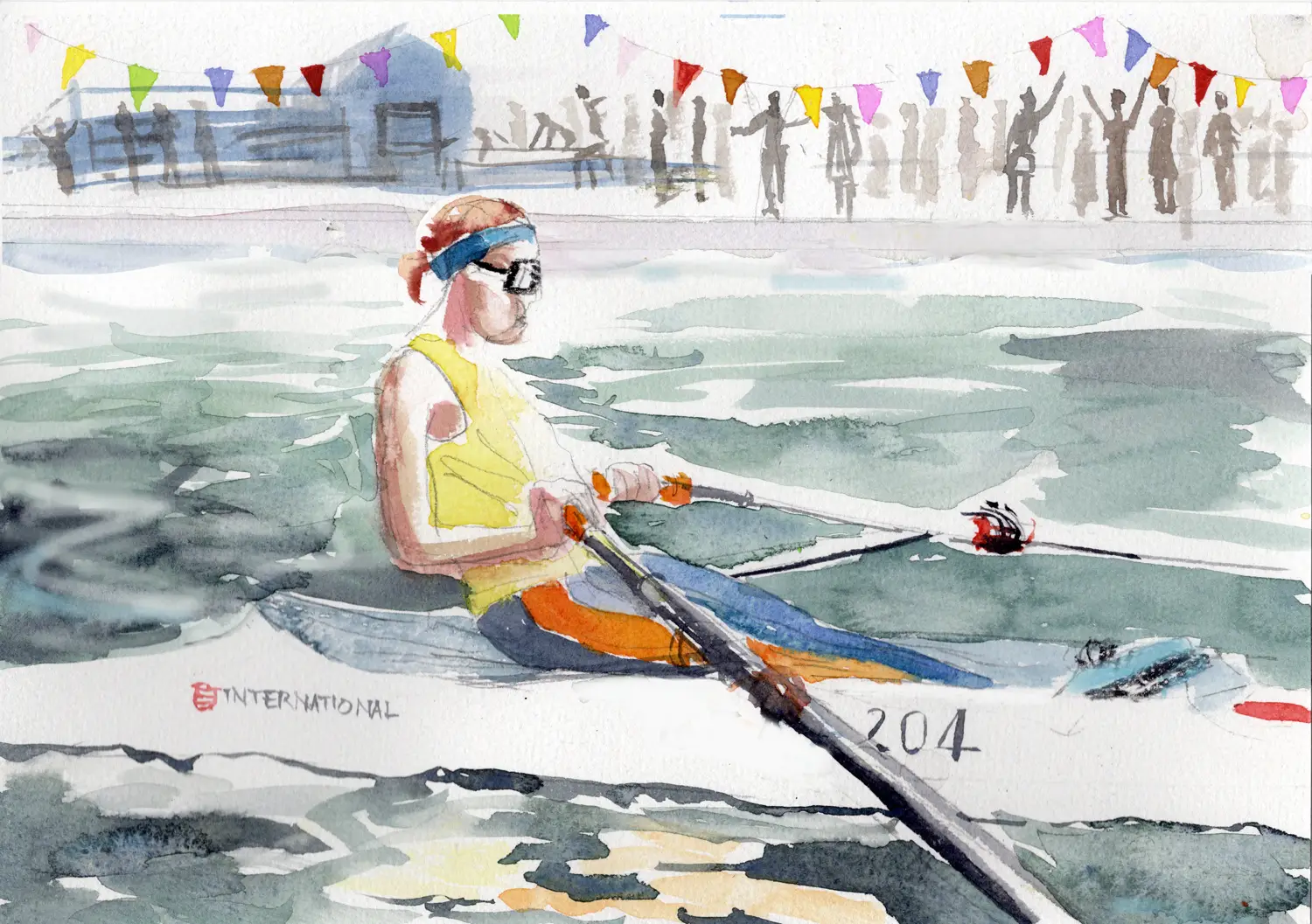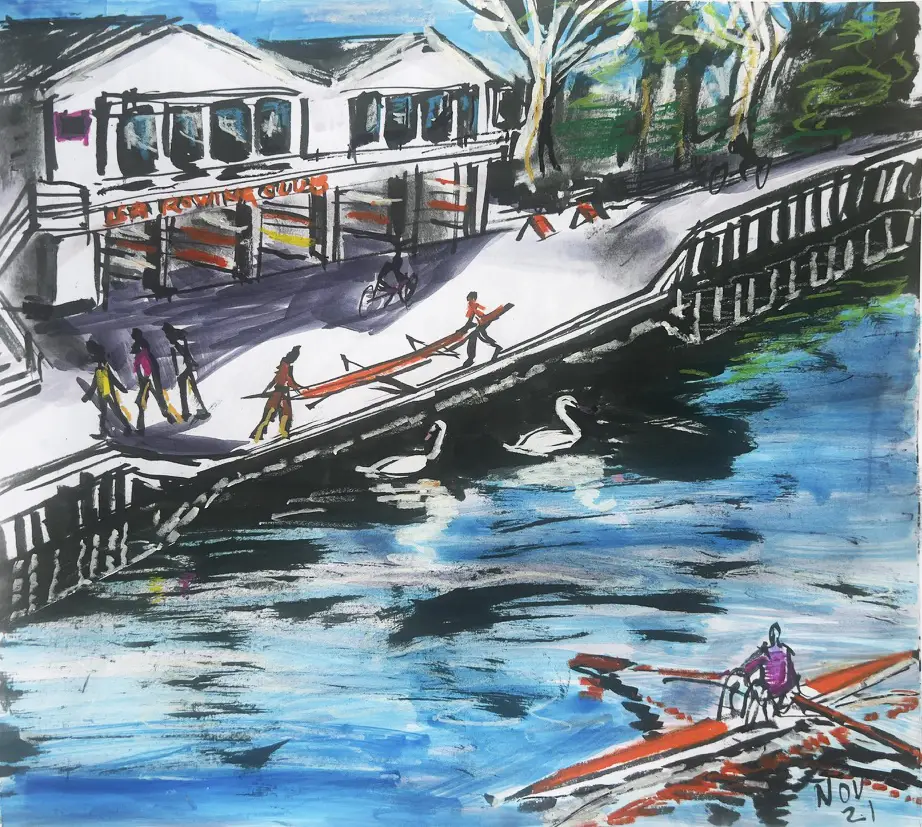 I rowed for the Lea from 1997 to 2000 and never won a race. So we were the worst team but had the greatest enthusiasm. I am always intrigued by the dedication to the sport, the hours of training, cleaning boats and chatting in the Riverside Cafe. I love to capture the energy and emotion with raw vibrant colour, working with Acrylic, charcoal and conte pencils.