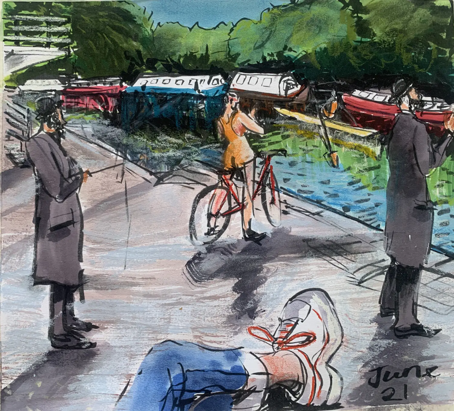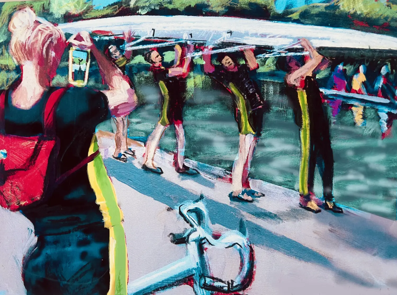 I captured a girl on a bike taking a snaphot of the rowers about to lower the boat into the water Acrylic on canvas panel 60cm x 40cm